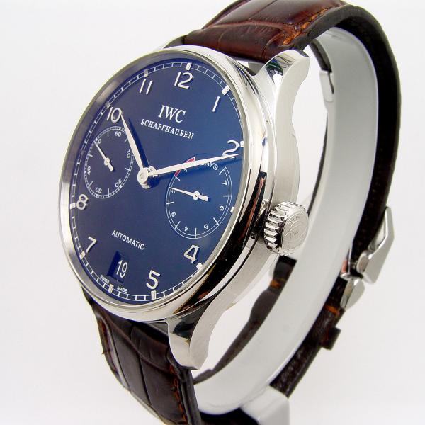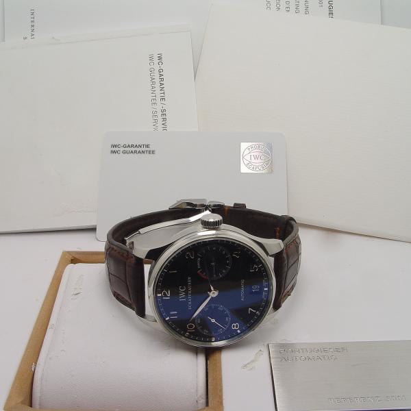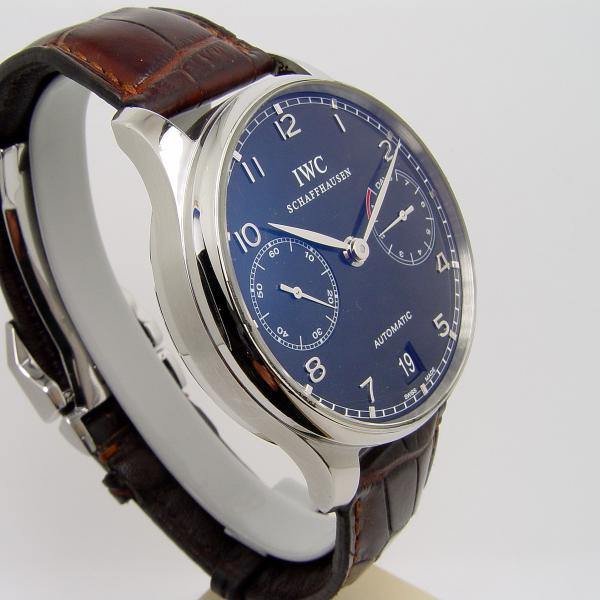 IWC Portugieser Automatik 7 Days 42mm Stahl Ref. IW 500109 aus 2004. Zifferblatt schwarz. IWC Lederband braun mit Faltschließe in Stahl. Uhr befindet sich in sehr gutem Zustand, leichte Tragespuren.