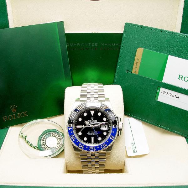 Uhr, Rolex Box, Umkarton, Oyster Booklet, GMT Booklet, Chronometersiegel, Hang Tag, Lünettenschutzring, Mäppchen, Original Rolex Zertifikat, Kaufrechnung mit 12 Monate Gewährleistung aus unserem Haus.